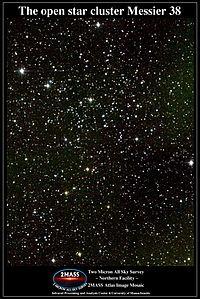 M38 is a diffuse open cluster at a distance of 3,900 light-years, the least concentrated of the three main open clusters in Auriga;[40] it is classified as a Trumpler Class II 2 r or III 2 r cluster because of this.[85] It appears as a cross-shaped or pi-shaped object in a telescope and contains approximately 100 stars;[40] its overall magnitude is 6.4.[9][10] M38, like M36, was discovered by Guillaume Le Gentil in 1749. It has an apparent diameter of approximately 20 arcseconds and a true diameter of about 25 light-years. Unlike M36 or M37, M38 has a varied stellar population. The majority of the population consists of A and B type main sequence stars, the B type stars being the oldest members, and a number of G type giant stars. One yellow-hued G type star is the brightest star in M38 at a magnitude of 7.9.[40] The brightest stars in M38 are magnitude 9 and 10.[85] M38 is accompanied by NGC 1907, a smaller and dimmer cluster that lies half a degree south-southwest of M38; it is at a distance of 4,200 light-years.[16] The smaller cluster has an overall magnitude of 8.2 and a diameter of 6.0 arcminutes, making it about a third the size of M38. However, NGC 1907 is a rich cluster, classified as a Trumpler Class I 1 m n cluster. It has approximately 12 stars of magnitude 9–10, and at least 25 stars of magnitude 9–12.[85]