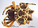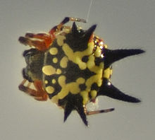 The opisthosoma (abdomen) is large, slightly wider than it is long, and strongly rounded at the front and back.[17][22] It is shiny black with bright colourful patterns. These colours can vary, but they are usually white, yellow, or yellow-orange.[23] Its most distinctive feature are the three pairs of large "spines" projecting outwards. The first two pairs on the front are close to each other, forming a V-shape as they point to the sides. They are short and roughly conical. The spines on the rear are longer and point backwards. There are wide spaces between them and the two front pairs. The spines are black or brownish black from above, but has a yellow-orange to rusty red lower surfaces.[10][17]