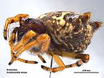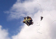 Austracantha minax is most commonly known as "jewel spiders" due to their body colouration.[2] This may sometimes be specified further as "Australian jewel spiders" due to the common name being shared with the unrelated North American jewel spider Araneus gemmoides,[3] as well as the widespread jewel box spider Gasteracantha cancriformis.[4] In some parts of Australia they are also widely known as "Christmas spiders" because they are most numerous during the summer months (December and January).[5][6][7] Other common names for the species include "six-spined spiders" and "spiny spiders" in reference to the spine-like projections on their abdomens.[8][9]