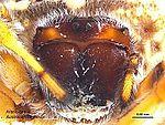 Jewel spiders have a distinctive appearance that makes them relatively easy to identify.[21] The cephalothorax is black in colour with a bluish metallic sheen.[22] It is covered with small white hairs (setae).[17] The carapace (upper part of the cephalothorax) is rectangular in shape.[22] The sternum (chest) is brownish black, with a yellow central area. The chelicerae (fangs) are black with four to six small teeth. The maxillae and other mouthparts are black at the base, lightening to brown and bright yellow at the tips. The pedipalps are dark brown.[17][22]