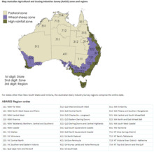 The Australian Agricultural and Grazing Industry Survey (AAGIS) is a large report compiled by ABARES which assesses broadacre industries on a yearly basis.[19] ABARES determines the target number and types of farms to include in the AAGIS survey. To do this, ABARES collects data on farms that participated in the survey in the previous year (and would like to participate in the current year) and then resample the remaining population to reach the target number and composition.[20] Furthermore, the data collected within the AAGIS survey is split into various zones as to aid consistent data interpretation.[19]