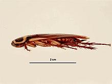 The Australian cockroach (Periplaneta australasiae) is a common species of tropical cockroach, with a length of 23–35 mm (0.91–1.38 in).[2][3] It is brown overall, with the tegmina having a conspicuous lateral pale stripe or margin, and the pronotum (head shield) with a sharply contrasting pale or yellow margin.[2][4] It is very similar in appearance to the American cockroach and may be easily mistaken for it. It is, however, slightly smaller than the American cockroach, and has a yellow margin on the thorax and yellow streaks at its sides near the wing base.