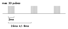 Auto-negotiation uses similar pulses labeled as NLP. NLP are still unipolar, positive-only, and of the nominal duration of 100 ns; but each LIT is replaced by a pulse burst consisting of 17 to 33 pulses sent 125 µs apart. Each such pulse burst is called a fast link pulse (FLP) burst. The time interval between the start of each FLP burst is the same 16 milliseconds as between normal link pulses (variation tolerance of 8 ms).