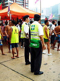 The Hong Kong Government decided to form the Auxiliary Medical Service in order to create a force that could assist the regular medical services during emergencies.[1] The establishment of the AMS was announced in the government gazette on 22 December 1950.[2] In early 1951 the AMS made a call for volunteers, including ordinary people who could be trained as auxiliary nurses, ambulance drivers, and other roles.[1] As the population of Hong Kong swelled with refugees from China in the post-Chinese Communist Revolution years, many lived in substandard housing areas susceptible to fires, landslips, storms, and other disasters, for which the AMS played a role in delivering emergency medical treatment. In the 1950s, AMS worked with St. John Ambulance to establish first aid posts all around the territory.[3]