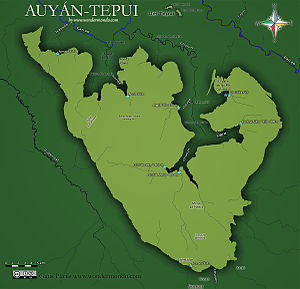Auyán-tepui gives its name to the Auyán Massif, which also includes the tiny peaks of Cerro El Sol and Cerro La Luna to the north, and the satellite mountain of Uaipán-tepui to the south. The massif has a total summit area of roughly 670 km2 (260 sq mi) and an estimated slope area of 795 km2 (307 sq mi).[1] It is situated entirely within the bounds of Canaima National Park.[5] Auyán-tepui means "Devil's House" in the local Pemón language.[6]