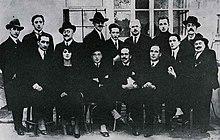 Editorial staff of Avanti! in 1905. From the left, seated, the first is satirical artist Gabriele Galantara and the second is Ivanoe Bonomi. At the middle there is the director Leonida Bissolati.