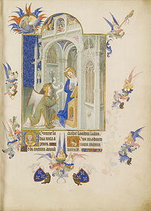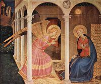 The prayer incorporates two greetings to Mary in Saint Luke's Gospel: "Hail, full of grace, the Lord is with thee."[2] and "Blessed art thou amongst women and blessed is the fruit of thy womb."[3][4] In mid-13th-century Western Europe the prayer consisted only of these words with the single addition of the name "Mary" after the word "Hail", as is evident from the commentary of Saint Thomas Aquinas on the prayer.[5]