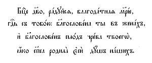 Богородице дѣво радѹйсѧ | Bogoroditse Djevo, raduisya, | Theotokos Virgin, rejoice, (or: Rejoice, O Virgin Theotokos) |