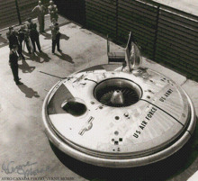 In mid-1954, Frost proposed "Project Y-2: Flat Vertical Take-Off Gyroplane" in response to requests by the US Air Force and US Navy for "vertical rising point-defense fighters".[20] In late 1954, the USAF purchased the development rights to this saucer-shaped VTOL vehicle powered by more conventional engines than, and designed to avoid many of the problems with, the Y-1. The USAF designated it Project MX-1794 and studies of the Avro saucer designs Project Silver Bug. Through 1958, Avro spent $2.5 million and the USAF $5.4 million funding the project. Numerous models were constructed and wind-tunnel testing was undertaken at MIT and Wright Patterson Air Force Base (where Roswell UFO studies were reportedly undertaken).