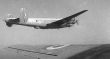 On 30 March 1951, the first Shackleton was delivered to No. 120 Squadron RAF; by the end of 1952 seven squadrons were operating the type.[36] The first operational deployment of the Shackleton occurred in 1955 as a troop-transport for British Army movements to Cyprus; less than a year later, the type's first combat deployment took place during the Suez Crisis, codenamed Operation Musketeer.[37]