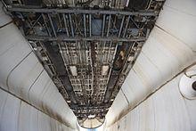 The Shackleton was a purpose-built aircraft for the maritime patrol role; however, the legacy of Avro's preceding aircraft is present in many aspects of the overall design. The centre section of the Shackleton's wing originates from the Lincoln, while the outer wing and undercarriage were sourced from the Tudor outer wings; at one stage during development, the tailplane had closely resembled the Lincoln's, but was enlarged and changed soon after.[2] An entirely new fuselage was adopted, being wider and deeper to provide a large space in which to accommodate the crew, their equipment, and a large bomb bay.[25][26] Later variants of the Shackleton were substantially redesigned, adopting a new nosewheel undercarriage, redesigned wings and centre-section, and a larger fuel capacity for more range.[27]