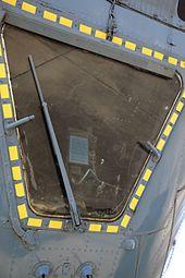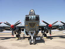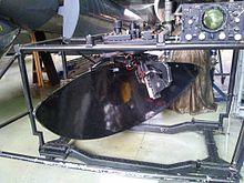Various armaments and equipment were carried by the Shackleton in order to perform its missions. In ASW operations, the ASV Mk 13 radar was the primary detection tool; it could detect a destroyer at a range of 40 nautical miles (46 mi; 74 km), a surfaced submarine at 20 nautical miles (23 mi; 37 km), and a submarine's conning tower at 8 nautical miles (9.2 mi; 15 km), although rough seas considerably reduced the radar's effectiveness.[28][29] Other equipment included droppable sonobuoys, electronic warfare support measures and an Autolycus diesel fume detection system. A special camera bay housed several reconnaissance cameras capable of medium altitude and nighttime vertical photography, and low-altitude oblique photography. The crew would also perform visual searches using various lookout positions that were provided for this purpose.[30] Weapons carried included up to nine bombs, three homing torpedoes or depth-charges; the aircraft also had two 20 mm cannon in a Bristol dorsal turret. An in-flight refueling receptacle could be accommodated, but was not fitted on production aircraft.[28]
