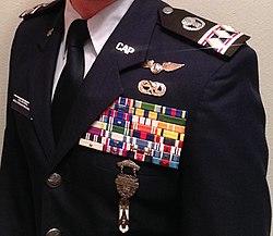 The awards and decorations of the Civil Air Patrol are "designed to recognize heroism, service, and program achievements" of members of the Civil Air Patrol (CAP) of the United States of America.[1] The CAP is the official auxiliary of the United States Air Force, and these awards are made to improve the esprit de corps of members.[1] These awards are all worn in the form of medals or ribbons and all are considered civilian decorations. Civil Air Patrol regulations allow them to only be worn and displayed on appropriate CAP uniforms.[2] In order to be considered for one of these awards, an individual must be a member in good standing of the Civil Air Patrol at the time of the act being recognized. There is a statute of limitations for these awards and all recommendations must be submitted within 2 years of the act being performed.[1] It is possible for the next of kin of deceased persons to be presented awards to which a member was entitled, but which he or she did not receive.[1] Award review boards are established at the region, wing, group, and squadron levels to consider recommendations for all awards and decorations.[1]