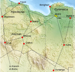 Muhammad ibn Ali as-Senussi stayed in Jalu and Awjila before opening his first lodge in al-Baida in 1843. Over the next ten years the lodges of the Senussi became established throughout the Bedouins of Cyrenaica.[23] Later they spread the Senussi influence further south, helping quell violence and resolve trade disputes.[24] Each post on the north-south route, including Awjila, was protected by a Senussi sheikh.[20] As late as 1907, a significant amount of the trade passing through Benghazi was in goods carried over this route, and goods would also have been routed from interior points such as Awjila and Jalu east to Egypt and west to Tripoli.[25]