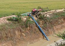 In agriculture and fisheries very large horsepower AFPs are used to lift water for irrigation and drainage. In East Asia, millions of smaller horsepower (6-20 HP) mobile units are powered mostly by single cylinder diesel and petrol engines. They are used by smaller farmers for crop irrigation, drainage and fisheries. Impeller designs have improved as well bringing even more efficiency and reducing energy costs to farming there. Earlier designs were less than two meters long but nowadays they can be up to 6 meters or more to enable them to more safely "reach out" to the water source while allowing the power source (many times two-wheel tractors are used) to be kept in safer, more stable positions, as shown in the adjacent picture.