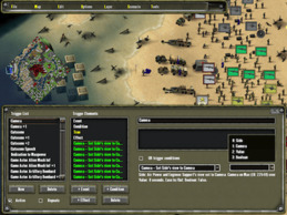 The Axis & Allies Map Editor allows players to make their own custom battle maps to play in both singleplayer and multiplayer mode.[18][1] Players are able to customize many map options, including player starting units, scenery objects, terrain layout, audio sources, and game triggers. Game triggers allow for custom creation of cutscenes, unit & VFX spawns, storylines, and military objectives.