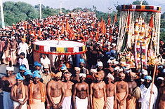 There are two yearly festivals for Ayyavazhi. The Ayya Vaikunda Avataram is celebrated on the twentieth day of the Tamil month Masi (March – April). This is the only Ayyavazhi festival to be celebrated as per the Solar calendar.[151] The mass procession conducted on this day from Nagercoil to Swamithoppe is a popular one in this part of the country.[152] The Thiru Edu-Vasippu is a festival of seventeen days celebrated in the Tamil month of Karthigai (November–December).[153] This celebration of textual reciting as a festival itself is a unique feature to Ayyavazhi. Apart from this, there is a tri-yearly celebration of Kodiyettru Thirunal in Swamithope. Another unique feature is the celebration of every day as a festival in Swamithope,(exclusive to Swamithope) called as 'Nitham Thirunal' .[154]