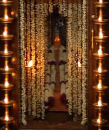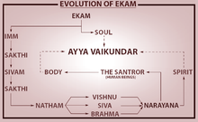 All of creation evolved from this Ekam, the supreme consciousness.[91] All the qualities of Ekam are within each soul, and evolve from it. Each and every individual soul is a reflection or mirror of the absolute Supreme, Ekam,[92] which provides the textual basis and metaphor for the mirror's role in Ayyavazhi worship. Human and all other souls are restricted and limited by the evil of Kali. This is why individual souls are not able to attain supreme bliss, and so are secondary to Ekam. Once a soul overcomes the influence of maya, it becomes one with Ekam. Its individuality is gone, and thereby it is Ekam.[93] On the other hand, this supreme consciousness is personified as Paramatma (over-soul) by which, God is the "Husband", while all other souls are his "consorts",[94] symbolised by Thirukkalyana Ekanai, where Vaikundar marries the individual souls.[94] Also, the Ayyavazhi philosophy applies a common formula for the creation of human beings and the rest of the universe. Thus whatever exists externally to human beings exists also internally.[95]