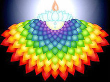 The mythical narration in akilam about the eight yugas is often viewed philosophically as a reference to eight chakras.[81] The first Neetiya Yukam, is Bindu and the final state, Dharma Yukam, is Sahasrara, or absolute bliss. In this series, the energy of consciousness (Namam) of oneself is invoked, rising from Bindu (Neetiya Yukam) to the final Sahasrara (Dharma Yukam). This lotus, the highest spiritual center of enlightenment is for experiencing the absolute "bliss".[82] The reigning power in the final Dharma Yukam (Sahasrara) is Ekam, which is a part of Vaikundar a Trinity conception, or a manifestation of the supreme absolute.[77] Thus Ayyavazhi's symbol is derived from Akilam. The symbol, "Lotus with Thirunamam", shows "Vaikundar's experienced in Sahasrara."