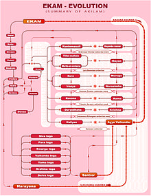 On mythical studies, Akilam covers almost the entire main mythology of Hinduism, including Mahabharata, Ramayana, Kantha Purana and Vishnu Purana, but with limited details.[141] It includes only the main events that are directly linked to the main-stream story flow. But to undergo a detailed study on each, the appropriate Hindu scriptures that include those events in detail need to be referred. Akilam provides all these collectively in brief with an overall story line, which make it unique.[142] Many philosophical concepts from Hinduism are found in Akilam; some of them are completely accepted,[143] some are regenerated,[136] while others are rejected.[144]