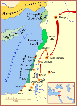 Saladin besieged Tiberias in the eastern Galilee on 3 July 1187 and the Crusader army attempted to attack the Ayyubids by way of Kafr Kanna. After hearing of the Crusaders' march, Saladin led his guard back to their main camp at Kafr Sabt, leaving a small detachment at Tiberias. With a clear view of the Crusader army, Saladin ordered al-Muzaffar Umar to block the Crusaders' entry from Hattin by taking a position near Lubya, while Gökböri and his troops were stationed at a hill near al-Shajara. On 4 July the Crusaders advanced toward the Horns of Hattin and charged against the Muslim forces, but were overwhelmed and defeated decisively. Four days after the battle, Saladin invited al-Adil to join him in the reconquest of Palestine, Galilee and Lebanese coast. On 8 July the Crusader stronghold of Acre was captured by Saladin, while his forces seized Nazareth and Saffuriya; other brigades took Haifa, Caesarea, Sebastia and Nablus, while al-Adil conquered Mirabel and Jaffa. On 26 July, Saladin returned to the coast and received the surrender of Sarepta, Sidon, Beirut, and Jableh.[48] In August, the Ayyubids conquered Ramla, Darum, Gaza, Bayt Jibrin, and Latrun. Ascalon was taken on 4 September.[49] In September–October 1187, the Ayyubids besieged Jerusalem, taking possession of it on 2 October, after negotiations with Balian of Ibelin.[50]
