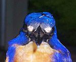 The azure kingfisher measures 17–19 cm (6.7–7.5 in) in length,[2] and the male weighs 29–32 g (1.0–1.1 oz) while the female is slightly heavier at 31–35 g (1.1–1.2 oz).[3] It is a very colourful bird, with deep blue to azure back, a large white to buff spot on the side of the neck and throat, rufous-buff with some blue-violet streaks on the breast and flanks.[4] The feet are red with only two forward toes.[4] The lores (the region between the eye and the bill) are white and inconspicuous except in front view, where they stand out as two large white eye-like spots which may have a role in warding off potential predators.