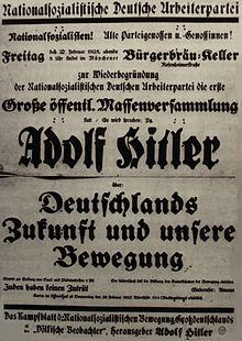 From 1920 to 1923, the Bürgerbräukeller was one of the main gathering places of the Nazi Party. There, on 8 November 1923, Adolf Hitler launched the Beer Hall Putsch. After Hitler seized power in 1933, he commemorated each anniversary on the night of 8 November with an address to the Alte Kämpfer (Old Fighters) in the great hall of the Bürgerbräukeller. The following day, a re-enactment was conducted of the march through the streets of Munich from the Bürgerbräukeller to Königsplatz. The event climaxed with a ceremony at the Feldherrnhalle to revere the 16 'blood martyrs' of the Beer Hall Putsch.[6]