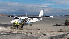 Barra's airport, near Northbay, uses the 2-mile-long (3 km) cockle shell beach of Traigh Mhor, (Scottish Gaelic: An Tràigh Mhòr "The Great Beach") as a runway. Planes can land and take off only at low tide, so the timetable varies. Voted the world's most scenic landing location using a scheduled flight,[43] Barra's airport is claimed to be the only airport in the world to have regular scheduled flights landing on a beach.[44] As of 2019 Loganair advertises flights to Barra in the de Havilland Canada DHC-6 Twin Otter, aircraft travelling to and from Glasgow. There are usually flights every day of the week in the summer.