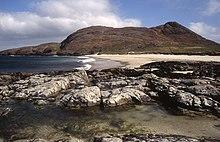 In common with the rest of the Western Isles, Barra is formed from the oldest rocks in Britain, the Lewisian gneiss which dates from the Archaean eon. Some of the gneiss in the east of the island is noted as being pyroxene-bearing. Layered textures or foliation in this metamorphic rock is typically around 30° to the east or northeast. Palaeoproterozoic age metadiorites and metatonalites forming a part of the East Barra Meta-igneous Complex occur around Castlebay as they do on the neighbouring islands of Vatersay and Flodday. A few metabasic dykes intrude the gneiss in the east.[8] The island is traversed by a handful of normal faults running WNW-ESE and by west-facing thrust faults bringing nappes of gneiss from the east. Blown sand masks the bedrock around Borve and Allisdale as it does west of Barra airport. Peat deposits are mapped across Beinn Chliaid and Beinn Sgurabhal in the north of the island.[9]