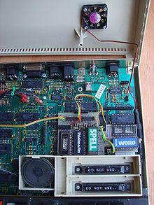 The cartridge and cassette ports were removed as a space saving measure, and RS-232 hardware not populated on the circuit board as standard. A multifunction mouse and joystick port was provided as a 9-pin D type with its function configured in software. A Centronics printer interface was also provided. The 1 MHz bus and analogue port were not provided on the Compact. Additionally, no internal sockets were provided for adding a co-processor or 2nd processor.[19] However, the machine did include a 50-way expansion edge connector on the right side of the keyboard, that was similar to cartridge socket #3 on a Master 128.[18](pp15,17) Various third-party suppliers restored some of the removed functionality via this connector such as support for Electron and Master 128 cartridges[20] and the provision of various BBC Micro expansion connectors.[21]