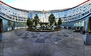 The building featured a central circular block (officially known as the Main Block, but often referred to by staff as the "doughnut") around which were studios, offices, engineering areas and the News Centre. In the centre of the main block was a statue designed by T.B. Huxley-Jones of Helios, the Greek god of the sun, to symbolise the radiation of television around the world. At the foot of the statue were two reclining figures, symbolising sound and vision, the components of television. It was originally a fountain, but owing to the building's unique shape it was too noisy for the staff in the overlooking offices, and there were problems with water leakage into the videotape area which for a long time was directly beneath. Even though there was a foundation stone marked 'BBC 1956' in the basement of the main building, construction began in 1951.[37] Various extensions have been added.