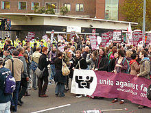 For Question Time on 22 October 2009, the BBC invited the leader of the British National Party, Nick Griffin, onto the programme for the first time causing heated public debate and strong protests outside the studios.[72] Television Centre had its security breached with around 30 anti-fascist protesters storming the reception area and several hundred protesters gathering outside. Police and security staff were forced to close gates leading into the Centre and form barriers to prevent any further breaches of security.[73]