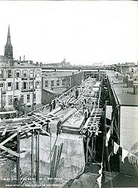 The first section of the line ran over Myrtle Avenue from Johnson and Adams Streets to a junction with what was then known as the Main Line at Grand Avenue and was opened on April 10, 1888 by the Union Elevated Railroad Company, which was leased to the Brooklyn Elevated Railroad for its operation.[4][5][6] Trains continued along Grand Avenue and Lexington Avenue to Broadway, where the line joined the Broadway Elevated, and then along Broadway to East New York. On September 1, 1888, the line was extended westward along Adams Street and Sands Street, to a terminal at Washington Street for the Brooklyn Bridge. On April 27, 1889, the line was extended east along Myrtle Avenue to Broadway.[4][6]