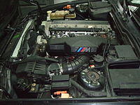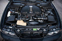 The E39 M5 is powered by the BMW S62 V8 engine, which generates a power output of 294 kW (400 PS; 394 hp) at 6,600 rpm and 500 N⋅m (369 lb⋅ft) of torque at 3,800 rpm.[35][42] The S62 engine has electronically actuated individual throttle bodies, an aluminium block and heads, variable valve timing (double-VANOS), and a semi-dry sump oil system.