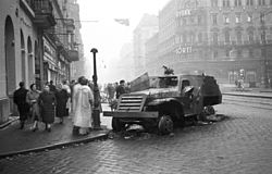 BTR-152s first saw combat during the Hungarian Revolution of 1956, when they were deployed by the 12th Motorized Brigade of the Soviet Internal Troops to crush Hungary's fledgling uprising.[18] The BTRs were deployed in Budapest and other settlements, as well as on the Hungarian border with Austria.[18] A number were damaged or destroyed by insurgents armed with molotov cocktails, which were pitched into the open troop compartments without apparent difficulty.[15] Since they were wheeled, some BTR-152s were also immobilized when their rubber tires caught fire, and had to be abandoned by their crews.[18]