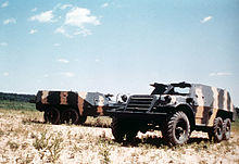 The BTR-152 (also known as BTR-140) is a six-wheeled Soviet armored personnel carrier (БТР, from Бронетранспортер/Bronetransporter, literally "armored transporter"),[8] built on the chassis and drive train of a ZIS-151 utility truck. It entered service with a number of Warsaw Pact member states beginning in 1950, and formed the mainstay of Soviet motor rifle battalions until the advent of the amphibious BTR-60 series during the 1960s.[9]