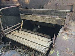 Two types of seating arrangements were available: the first consists of wooden benches on either side of the troop compartment facing inwards; the second consisted of three rows of seats facing forward.[11] Both the driver and the radio operator seated to his right are provided with individual windscreens and, when in combat, these are covered by twin armored shutters with integral vision blocks.[11] Crew members exit the vehicle through side doors, the tops of which are hinged and fold down for observation purposes.[11]