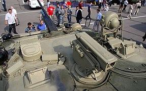 The layout and positioning of equipment and parts in the BTR-90 is similar to those of the BTR-80 and BTR-80A. The commander and gunner are accommodated in a fighting compartment in the turret. This compartment also houses a BPK-3-42 gunner's day/night sight and a 1P-13 commander's optical sight.[5] Optionally, a BPK-M thermal imaging sight can be fitted in this compartment as the gunner's sight.[2]