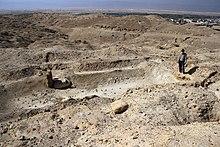 The ancient name of Bab-edh-Dhra still remains unidentified.[3] Some biblical scholars argue that this was the site of "Sodom".[4] Other archaeologists disagree.[5] Unlike the neighboring ruins of Numeira, Bab edh-Dhra does not appear to have been destroyed by a significant fire.[6] Numeira and Bâb edh-Dhrâʿ were destroyed at different times, about 250 years apart. While the early conclusions of Rast and Schaub, that Bâb edh-Dhrâʿ and Numeira were both destroyed at approximately the same time (i.e., 2350–2067 BC), are often reported, it is now known that their individual destruction was separated by approximately two and a half centuries (250 years), with the destruction of Bâb edh-Dhrâʿ at ca. 2350 BC[7] and Numeira at ca. 2600 BC.[8] Instead, archaeological evidence suggests that the site was abandoned by its inhabitants, but also "suffered exposure to fire".[9] Other possible reasons this site may not be the biblical Sodom are because the village was too small (10 acres), not in the designated geographical area (Genesis 13:10–12) and did not exist in the appropriate time period. Bab Edh-Dhraʿ was destroyed in 2350 BC (Early Bronze period), while most biblical scholars believe that the Patriarchs lived in the Middle Bronze period (2166–1550 BC).[10] Supporters of the Southern Sodom theory have argued that, on closer examination to the biblical account, this does fit the geographical description of where Sodom would be located. They also argue that a set time frame for its destruction is not necessarily reliable.[11] Proponents of the Southern Sodom theory have put forward various hypotheses to explain the causes of its abandonment. Rast suggested an earthquake or an external attack.[12] Bitumen and petroleum deposits have been found in the area, which contain sulfur and natural gas (as such deposits normally do), and one theory suggests that a pocket of natural gas led to the incineration of the city. However, archaeologists who worked at the site found no evidence of a conflagration, or indeed, any sort of catastrophe to explain the sudden desertion of its inhabitants.