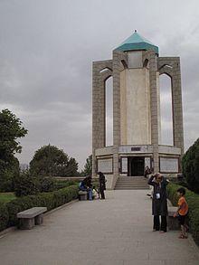 His tomb, designed by Mohsen Foroughi, is located near the northern entrance of the city of Hamadan in Western Iran, in a park, surrounded by flowers and winding paths. The structure consists of twelve external pillars surrounding a central tower. It was constructed in 1970.