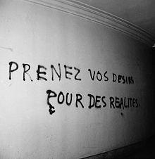 Some well-known slogans among youth rebels were, "When I think of revolution I want to make love," "I take my desires for reality and I believe in the reality of my desires," and "We want everything and we want it now!" These were evidently not what would normally be recognized as political slogans; rather, they were subjective expressions of the private individual.[18]
