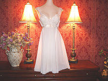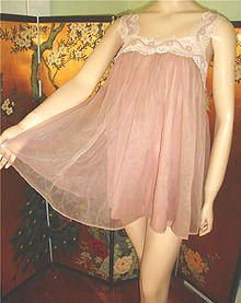 A babydoll is a short, sleeveless, loose-fitting nightgown or negligee, intended as nightwear for women. It sometimes has formed cups called a bralette for cleavage with an attached, loose-fitting skirt falling in length usually between the belly button and upper thigh. The garment is often trimmed with lace, ruffles, appliques, marabou, bows, and ribbons, optionally with spaghetti straps. Sometimes it is made of sheer or translucent fabric such as nylon or chiffon or silk.
