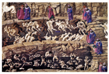 Vasari wrote disapprovingly of the first printed Dante in 1481 with engravings by Baccio Baldini, engraved from drawings by Botticelli: "being of a sophistical turn of mind, he there wrote a commentary on a portion of Dante and illustrated the Inferno which he printed, spending much time over it, and this abstention from work led to serious disorders in his living."[17] Vasari, who lived when printmaking had become far more important than in Botticelli's day, never takes it seriously, perhaps because his own paintings did not sell well in reproduction. Botticelli's attempt to design the illustrations for a printed book was unprecedented for a leading painter, and though it seems to have been something of a flop, this was a role for artists that had an important future.[18]