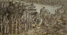 In total the group amounts to over 100 prints.[5] They are "characterized by rather sharp, often deeply incised outlines: similar deeply-cut graver work for the features, for the ample ornament of the costumes, and for the architecture; and extremely fine lines, organized into rather fuzzy cross-hatching, for the shading, which often gives the draperies an almost furry look". This technique was designed to capture the quality of pen and wash drawings, and he may be attributed with drawings as well.[6]