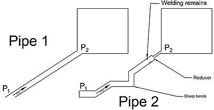 Fluid flows through a pipe because of the pressure difference between the two ends of a pipeline. The fluid will flow from the high-pressure end to the low-pressure end. Consider two systems as shown in the following figure. The flow in each case is caused by a pressure difference between P1 and P2. Pipe 2 has some obstructions (welding remains, a reducer, changes in area, sharp bends, etc.) which will create a pressure drop resulting in less discharge and a reduced rate of flow.