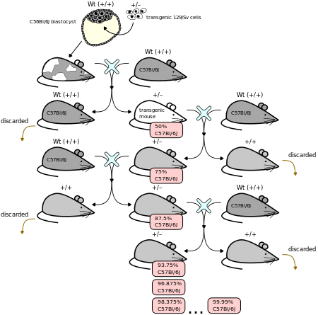 Backcrossing may be deliberately employed in animals to transfer a desirable trait in an animal of inferior genetic background to an animal of preferable genetic background. In gene knockout experiments in particular, where the knockout is performed on easily cultured stem cell lines, but is required in an animal with a different genetic background, the knockout animal is backcrossed against the animal of the required genetic background. As the figure shows, each time that the mouse with the desired trait (in this case the lack of a gene (i.e. a knockout), indicated by the presence of a positive selectable marker) is crossed with a mouse of a constant genetic background, the average percentage of the genetic material of the offspring that is derived from that constant background increases. The result, after sufficient reiterations, is an animal with the desired trait in the desired genetic background, with the percentage of genetic material from the original stem cells reduced to a minimum (in the order of 0.01%).[3]