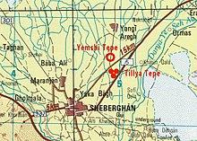 The heavily fortified town of Yemshi Tepe, just five kilometres to the northeast of modern Sheberghan on the road to Akcha, is only half a kilometre from the now-famous necropolis of Tillia-tepe.