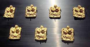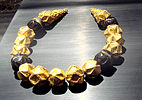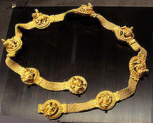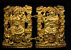 The hoard is a collection of about 20,600 ornaments, coins and other kinds of artifacts, made of gold, silver, ivory etc., that were found in six burial mounds (five women and one man) with extremely rich jewelry, dated to around the 1st century BCE-1st century CE.[1] The ornaments include necklaces set with semi-precious stones, belts, medallions and a crown. After its discovery, the hoard went missing during the wars in Afghanistan, until it was "rediscovered" and first brought to public attention again in 2003. A new museum in Kabul is being planned where the Bactrian gold will eventually be kept.