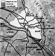 In the course of the 19th century language conflict, nationalist struggles in the ethnically mixed area arose between the predominantly German-speaking citizens and the Slovene-speaking peasant population down the Mur River. A garrison town of the Austro-Hungarian Army in World War I, it was occupied by troops of the newly emerged Kingdom of Serbs, Croats and Slovenes (Yugoslavia) on 1 December 1918. An armed revolt against the occupation forces, led by Johann Mickl, in order to affiliate the town with German-Austria failed. Nevertheless, by resolution of the 1919 Treaty of Saint-Germain, the area north of the Mur passed to the First Austrian Republic, while Oberradkersburg (Gornja Radgona) and the neighbouring municipality of Apače (Abstall), on the south bank, became part of Yugoslavia.