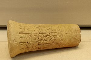 Some badly effaced half-bricks on the surface of the mound bore the inscription of Amar-Sin, of the Third Dynasty of Ur. Pieces of vitrified brick scattered over the surface of the large mound bore witness to the city's destruction by fire.[9] Possession of the city passed between Larsa, whose king Sin-Iddinam claims to have built the great wall of Bad-tibira, and Isin, whose king Lipit-Ishtar, "the shepherd of Nippur", claimed to have built the "House of Righteousness" there.[10]
